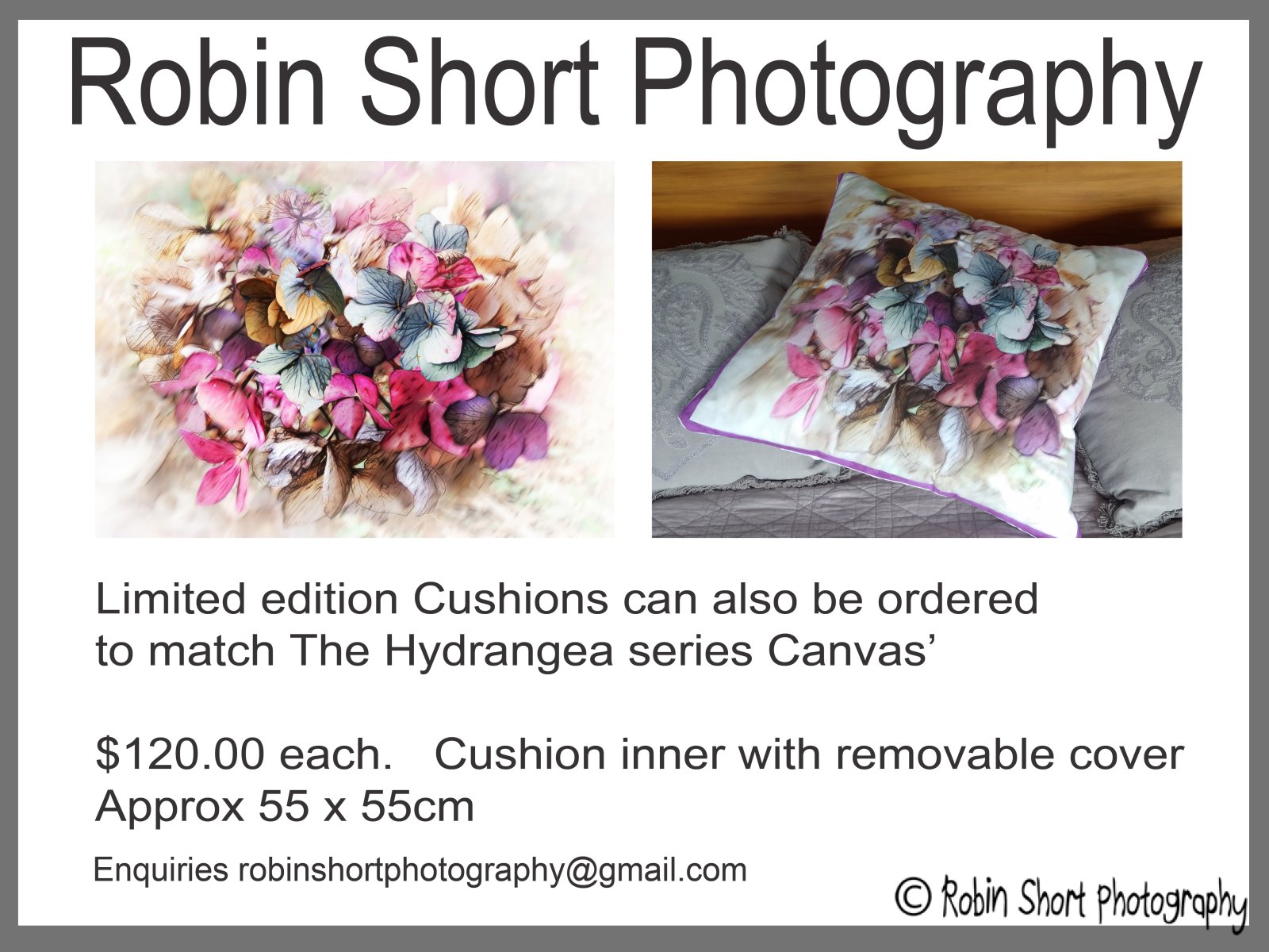 This collection is Limited edition. Only 5 of each for sale. To purchase these, you must contact me robinshortphotography@gmail.com. Prints can be ordered as fine art prints or on stretched canvas'...framed or unframed. Cotton Drill Cushions can also be ordered to match these images